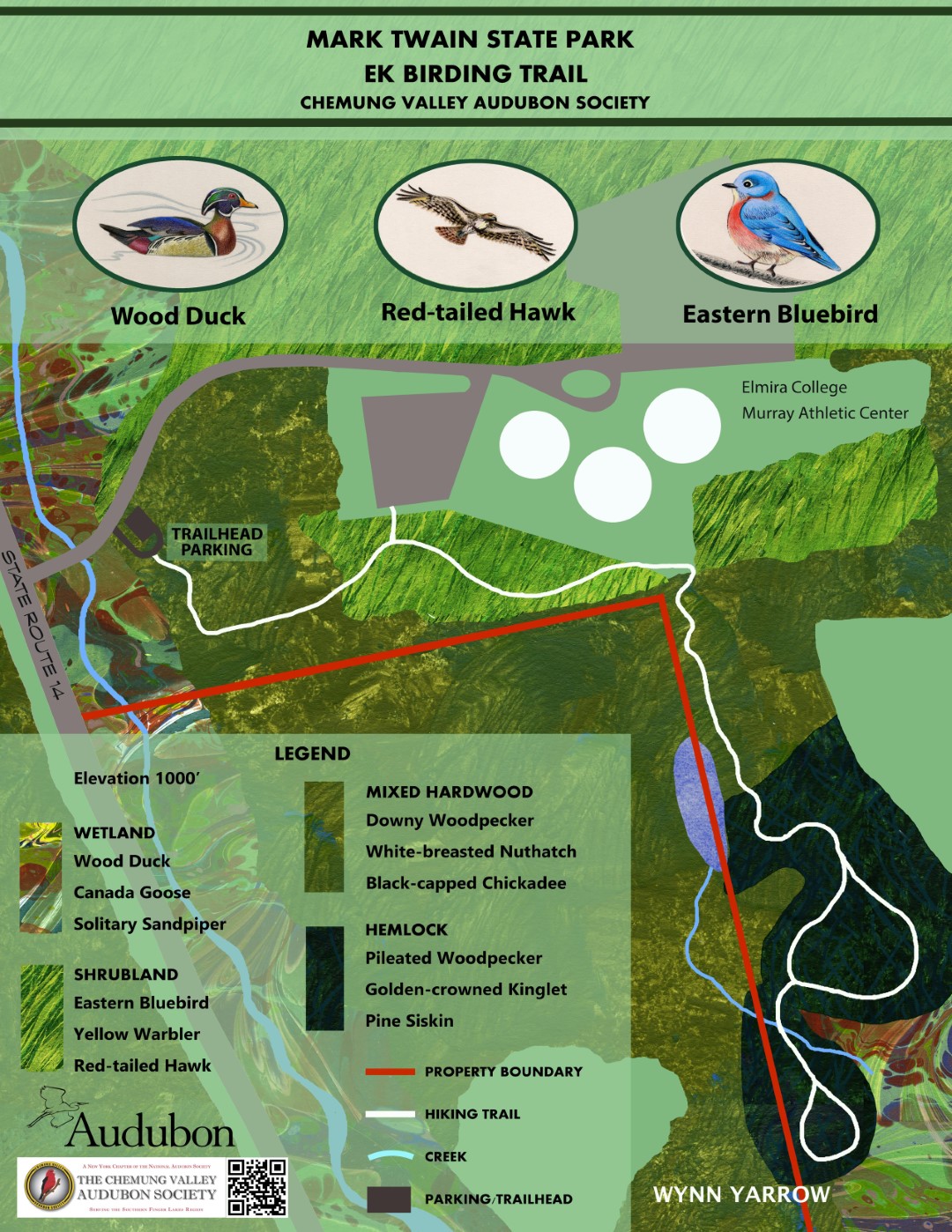 In Chemung County, CVAS partnered with Mark Twain State Park and Friends of the Catharine Valley Trail to build the Ek Birding Trail (view the map). Named to honor Rick and Betty Ek, of Horseheads, the trail winds through deciduous forest, shrub land, and hemlock forest and is surrounded by a cattail marsh along Catharine Creek. The Eks had the vision for the project and laid the groundwork to create the new trail, thereby extending the long-established Catharine Valley Trail into Mark Twain State Park. The trail is accessible from parking areas at the Elmira College Murray Athletic Center (“The Domes”) located along Route 14 at 170 Huck Finn Road in Horseheads.