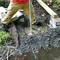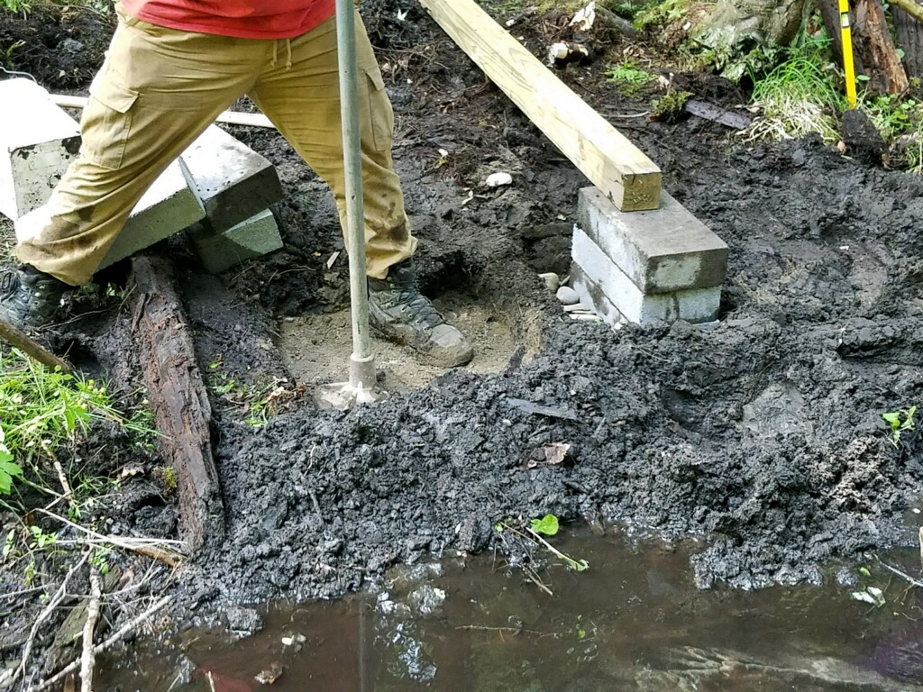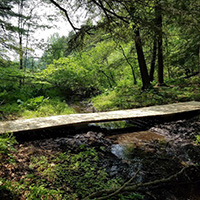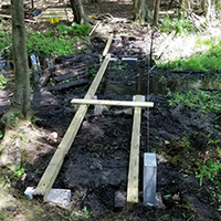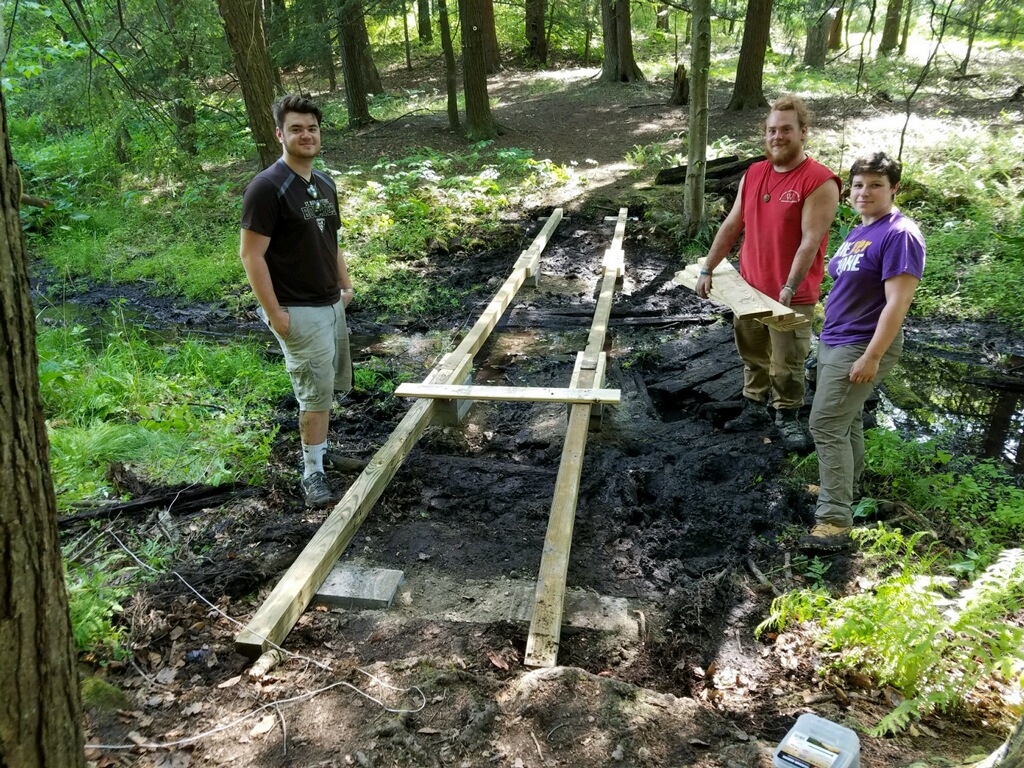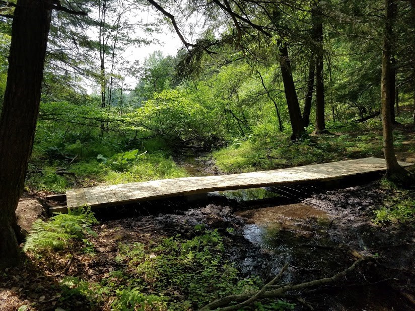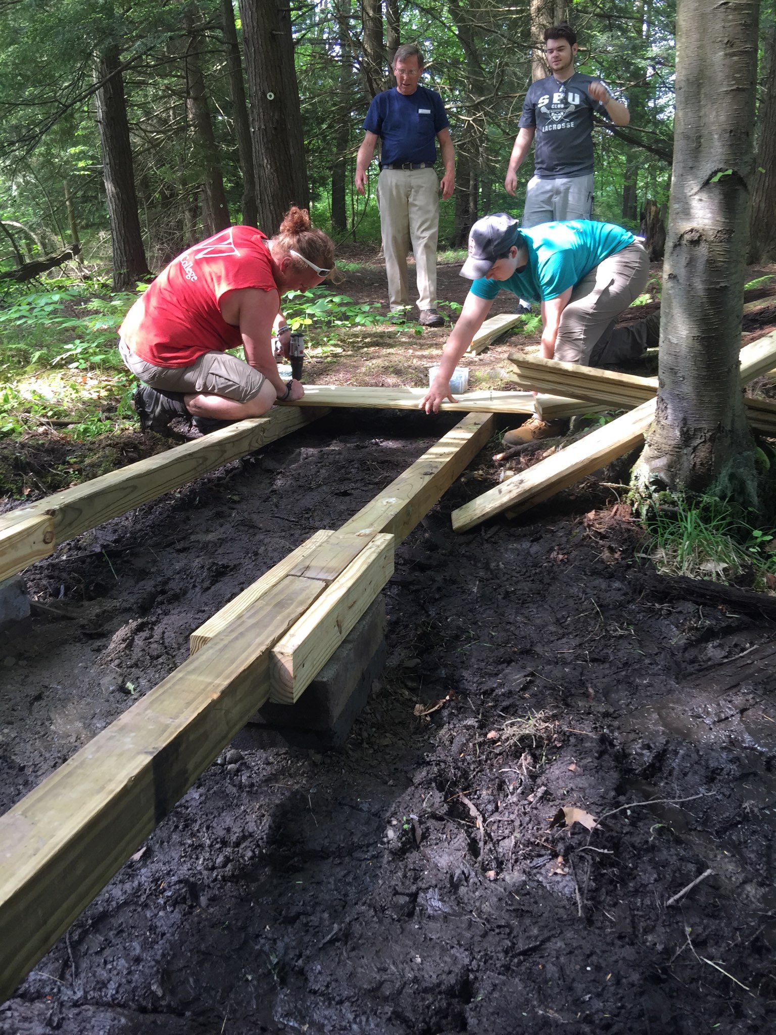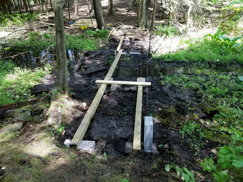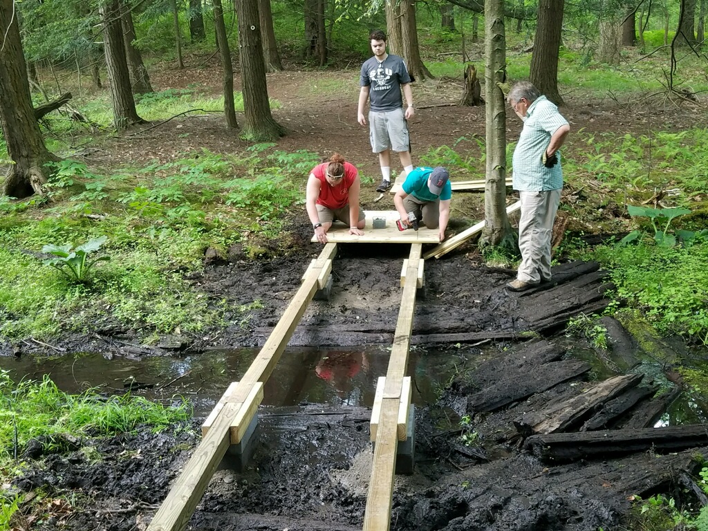 The birding/hiking trail going to the outer loop crosses an intermittent stream that had a log crossing. Over time, the logs had been covered by moss, and the crossing had become unstable and dangerous. Chemung Valley Audubon Society offered to replace the log crossing with a boardwalk. Working with the park manager, we developed plans for a boardwalk that was reviewed by a state park engineer. Once approved, we purchased the lumber and supplies. On May 30, 2018, members of Chemung Valley Audubon Society and summer interns from NYS Parks started building the boardwalk by placing the footers and main beams. Mark Twain State Park personnel provided great assistance by providing carts to transport the lumber and gravel to the site. The boardwalk was completed on June 1, 2018, by installing the planks and cleaning up the site. The great assistance and cooperation from the NYS Parks, Mark Twain State Park, summer interns, and members of Chemung Valley Audubon made this an enjoyable project. Now hikers have a nice boardwalk to safely cross the intermittent stream to enjoy the outer loop of nature trail.
