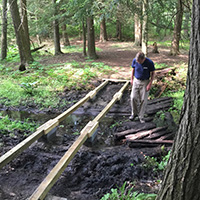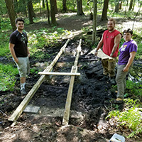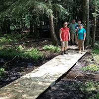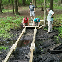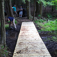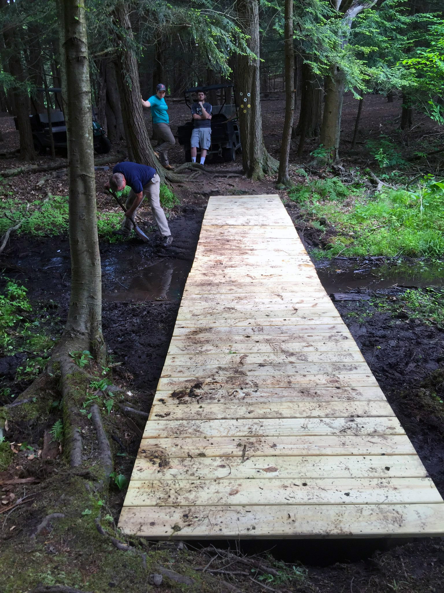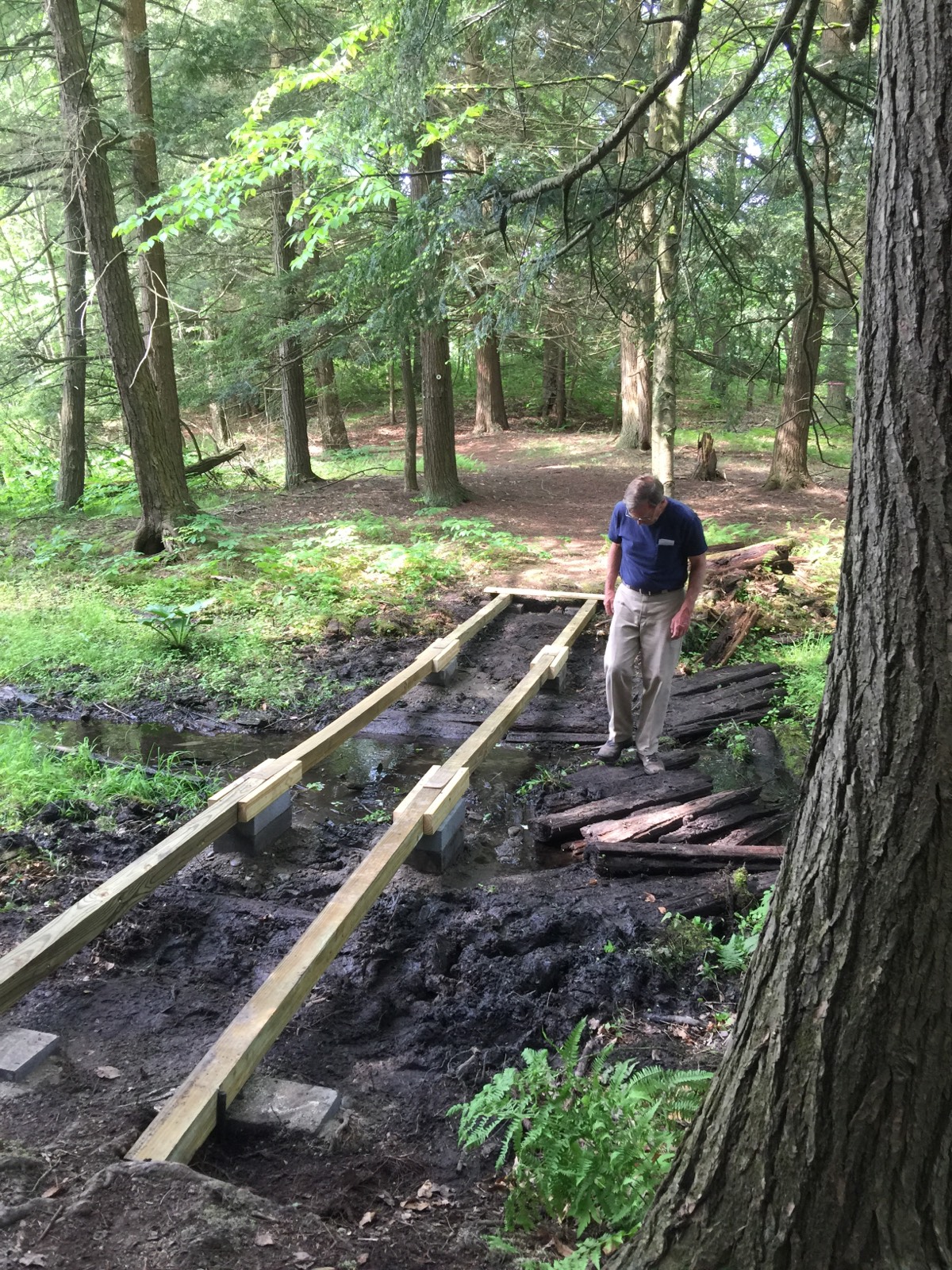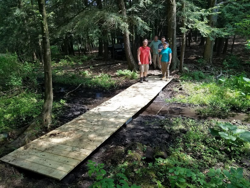 The first Saturday in June is National Trails Day, and in honor of the event, two volunteer Finger Lakes Trail Stewards working for the Finger Lakes Trail Crew and three volunteers from the Chemung Valley Audubon Society met to complete the installation of a boardwalk across a muddy section of the birding trail at Mark Twain State Park.
