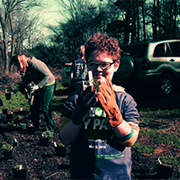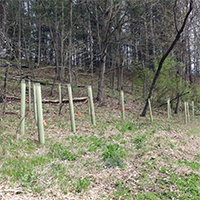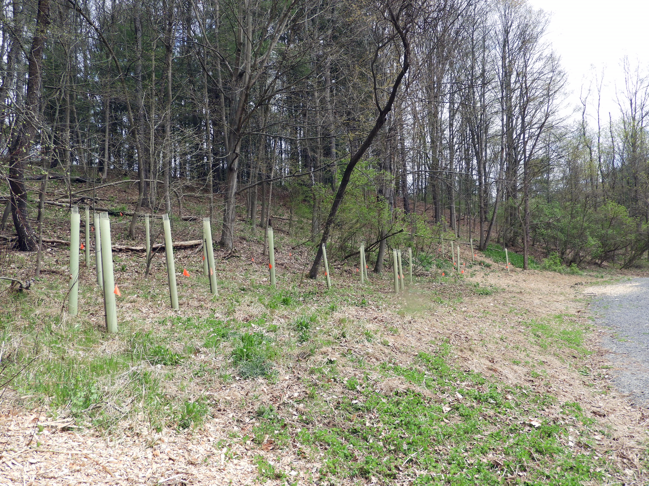 On the parking lot's east slope, volunteers removed invasive species, vines, and dead branches, then raked the entire slope along the parking lot edge. CVAS purchased five potted native shrubs at Plantsmen Nursery including chokecherry, northern bayberry, witch-hazel, and serviceberry. The volunteers planted the shrubs and 25 seedlings of native trees including black cherry, red maple, and red oak. Later, we installed tree shelters to protect the seedlings from deer.