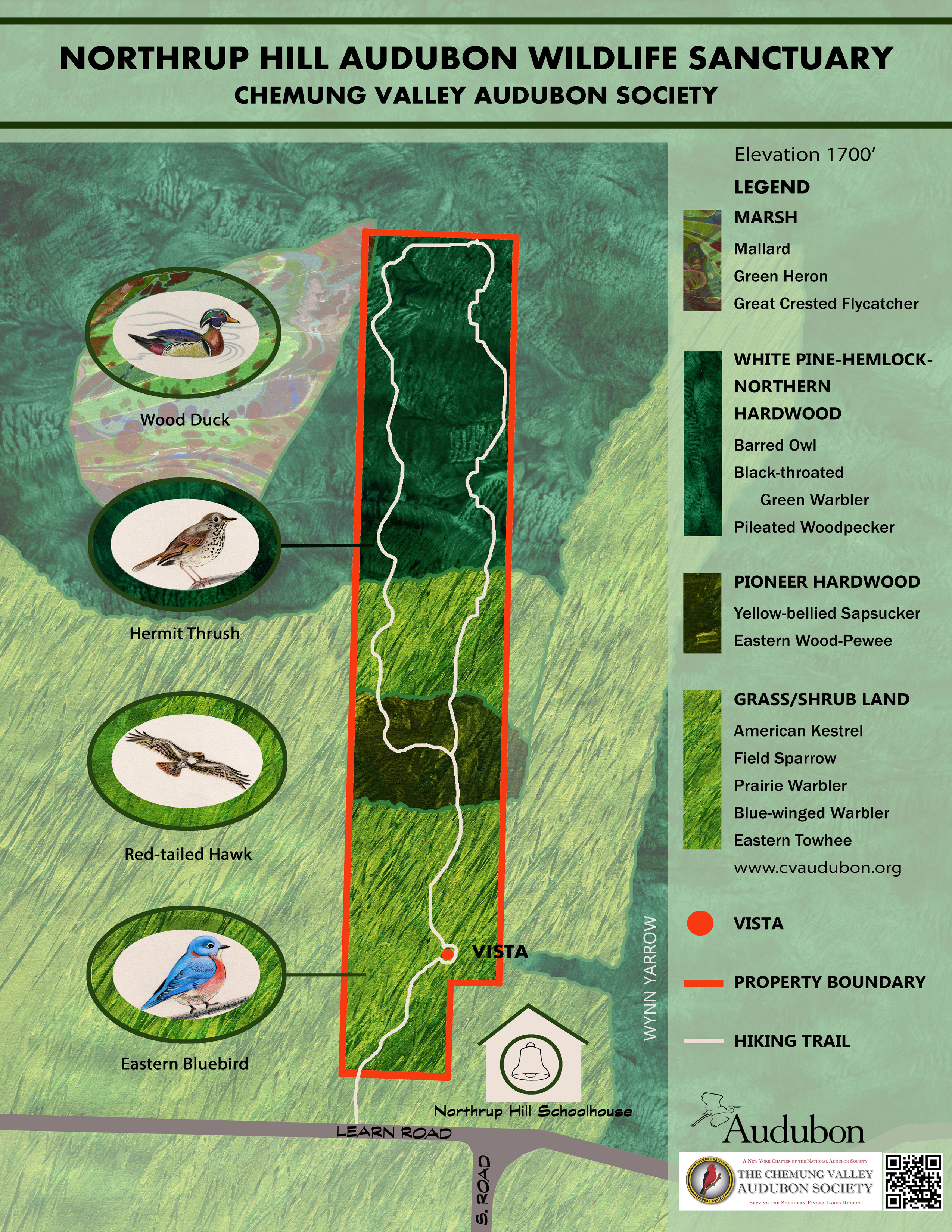 From Corning, take Route I86 to exit 44A for Route 15 (I99) South. Follow Route 15 South to exit 8 for Route 417-Addison. Turn right off the ramp and follow Route 417 to Addison. In Addison, turn right onto CR 119 (by Wades Hardware Store). Continue on 417 to Rathbone and turn left onto CR 21 (by Rathbone Town Hall-Highway Department). Go a short distance going over a creek and turn right onto CR 80. Route 80 curves slightly to the left and then continues on for one mile to Learn Road. Turn left onto Learn Road and proceed two miles. You will pass the Northrup Hill Schoolhouse and the wildlife sanctuary entrance is 200 feet beyond on the right by the sign. Please park on the side of the road.